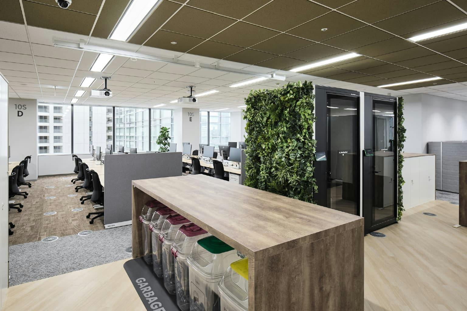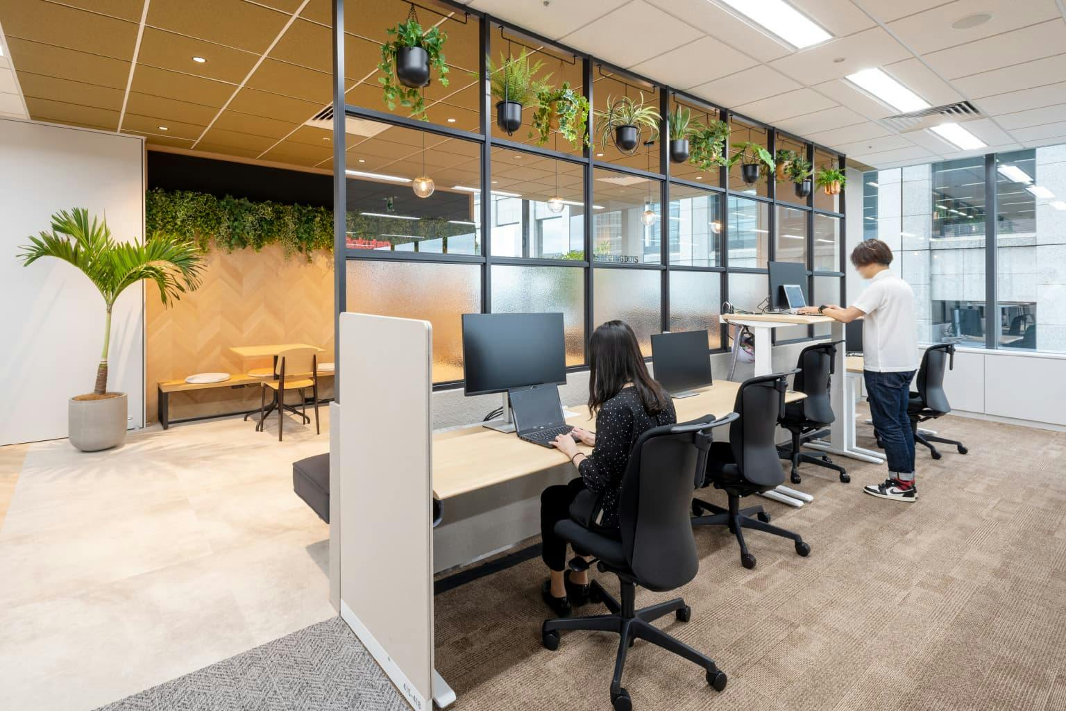 例えば、社員同士のミーティングで使える入り口付近の「ハドルスペース(Core Side)」は執務スペースとなめらかにつなげて、空間の一体感を演出。 一方でフリースペースである窓側の「ハドルスペース(Window Side)」は、天然の緑やリラックスできる家具を取り入れ、オフィス特有の無機質な雰囲気を抑えています。