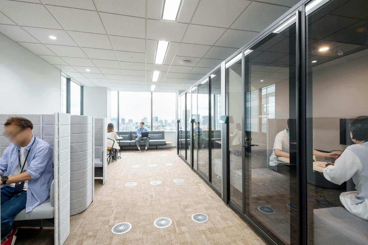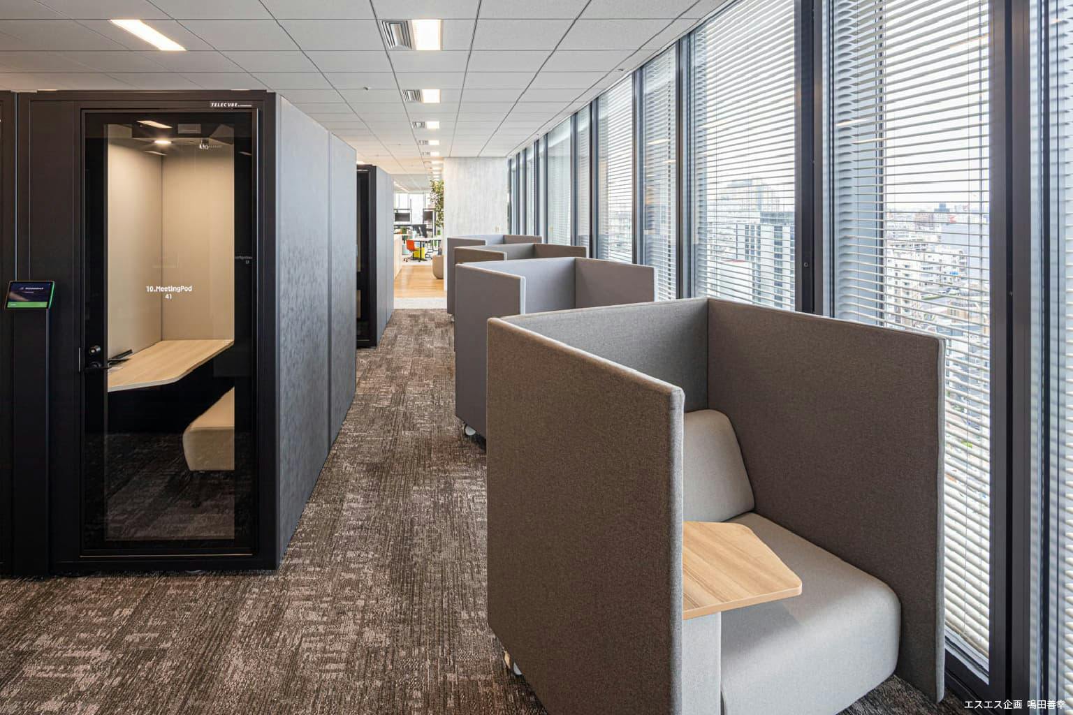 執務エリアには遮音性の高いフルクローズ型ワークブースと、オープンなカジュアルブースも複数配置されています。 WEBミーティングや少人数での打ち合わせ、一人で没頭したい作業など、シーンに合わせて働く場所を選べます。 個人の集中力を高めながら、フレキシブルに社内外の人とつながりが持てる工夫――そこから、社員一人ひとりの多様な働き方を尊重したいという同社の想いが伝わってきます。