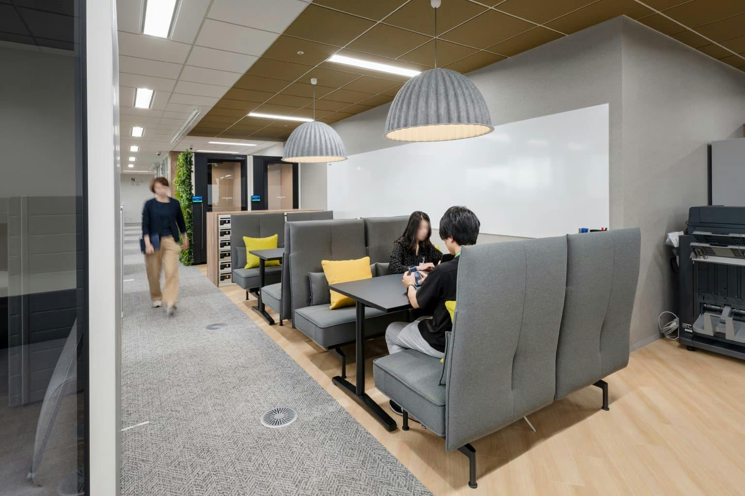 “余白“のひとつであるハドルスペース(Core Side)は、思い立ってすぐ打ち合わせができる場所。 執務エリアの近くに配置されているので、自席の延長という感覚でスムーズに移動することができます。 スペース内にはソファと観葉植物が配置され、まるで家のリビングのような居心地です。 程よいリラックス感は自由な発想を引き出します。