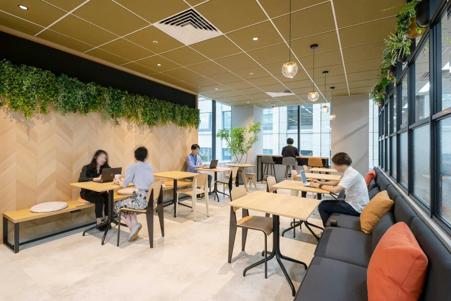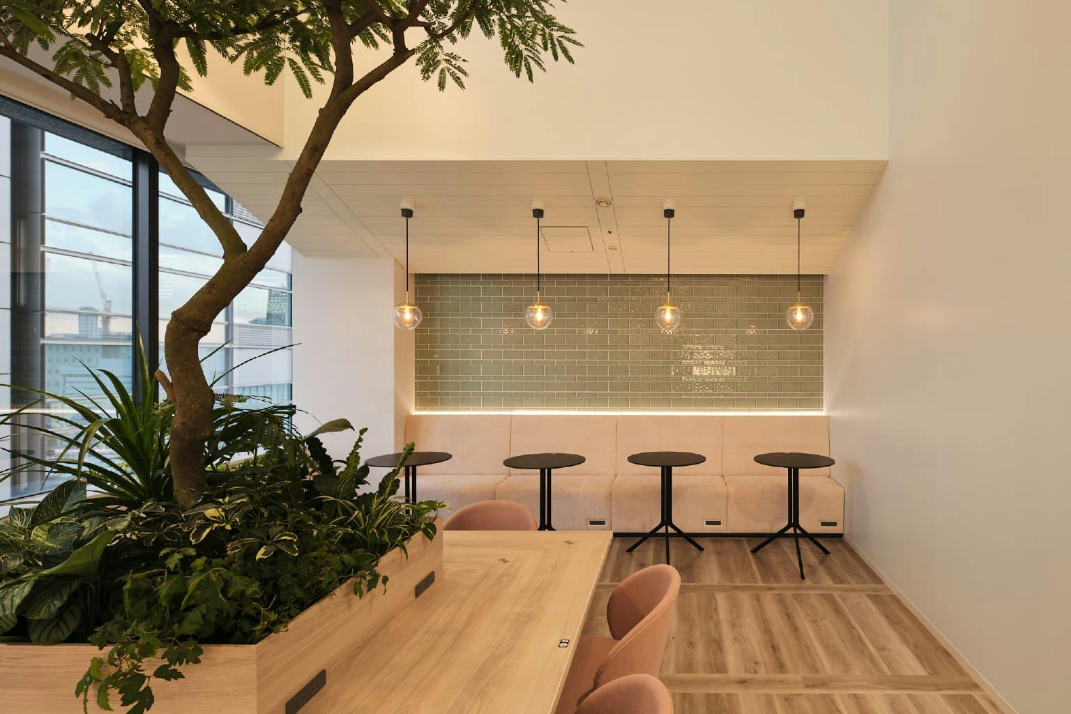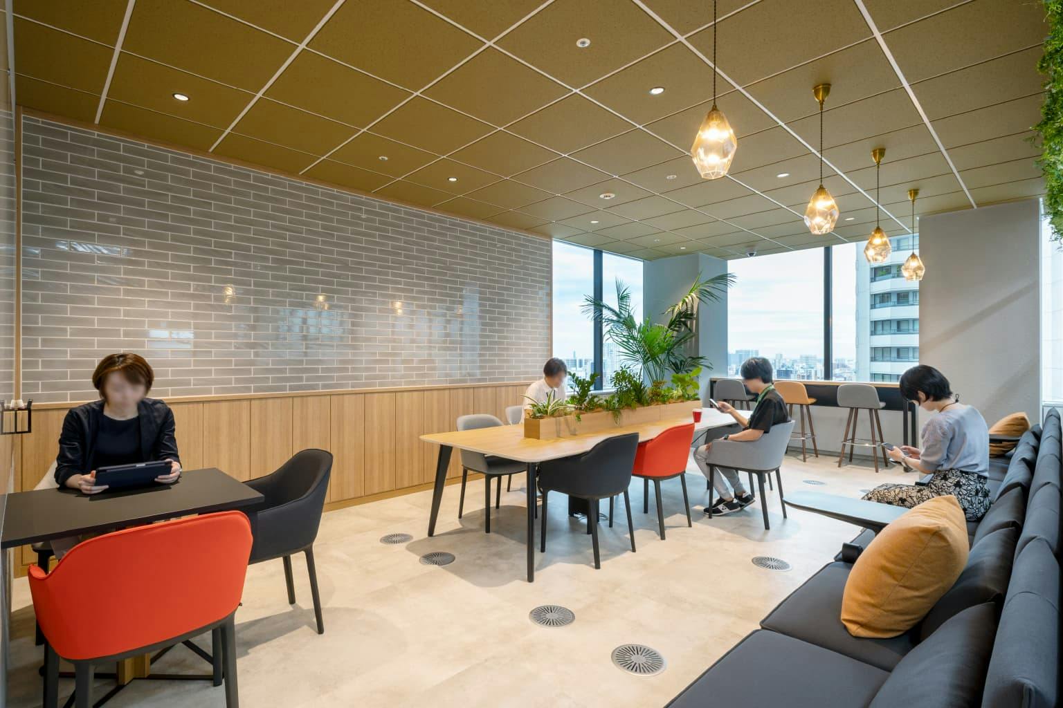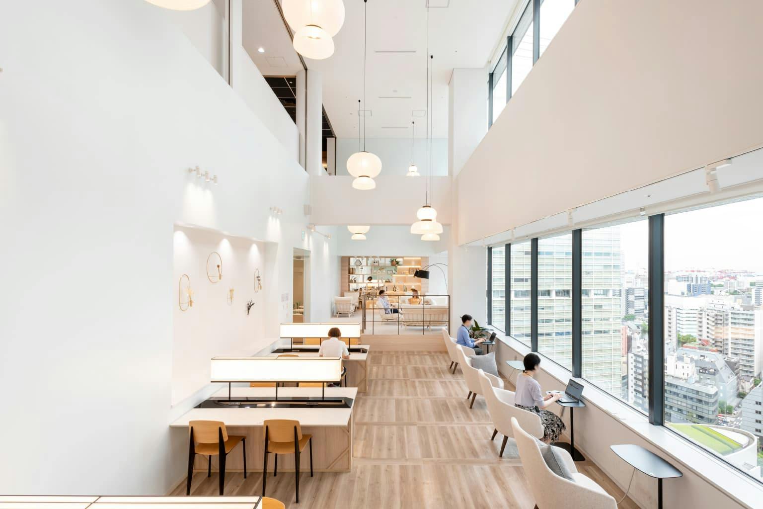 窓際のスペースは2フロアにまたがる吹き抜けエリア。 天井からはちょうちんを模した大ぶりのペンダントライトが吊り下げられ、柔らかな光が全体を照らしています。 まるでリゾートホテルのような、明るく解放的な空間にいると、ここがオフィスであることを忘れてしまいそうです。