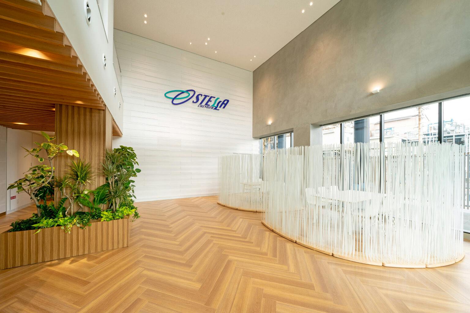 建物内に入ると床や天井には木が多く用いられ、開放的な空間が訪れた人々をあたたかく迎え入れてくれます。 ここは会社の顔であり「現在のステラケミファ」を感じられるエントランス。 化学メーカーならではのクリーンな印象と、木やグリーンなど自然素材の質感からサステナブル貢献への同社の想いが同時に伝わる空間です。 この場所ではちょっとした打ち合わせや来客対応も可能。 ミーティングスペースは、細い棒状のグラスファイバーで作られたパーティションで仕切られており、ほどよいプライベート感と空間全体の抜け感の両方が確保されています。