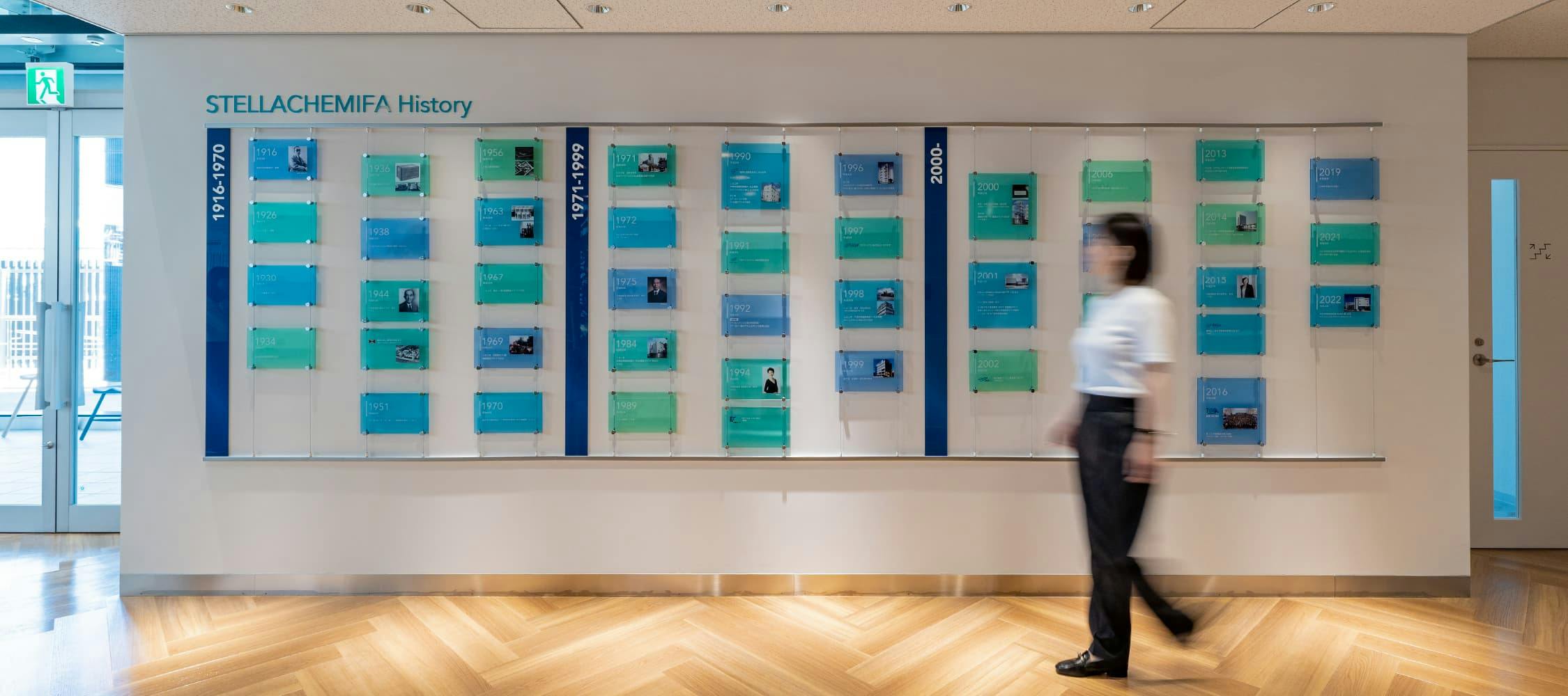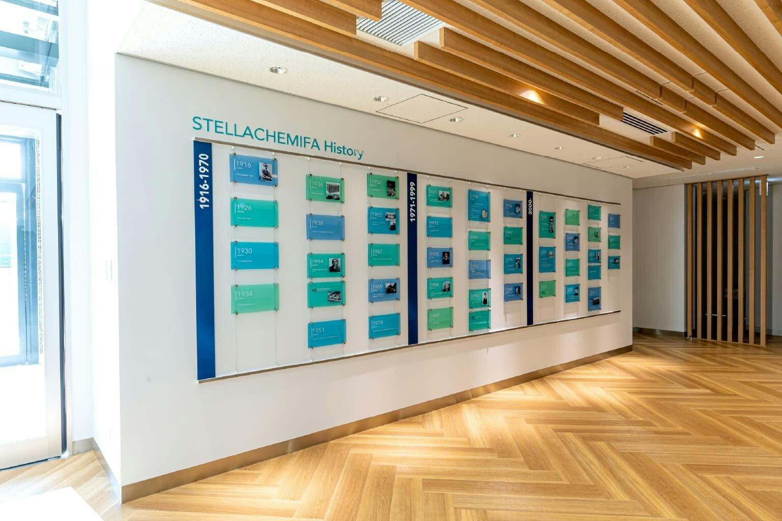 エントランスの傍らには、「これまでの100年」を振り返ることができるヒストリーウォールがあります。 ピクチャーレールから吊り下げられたアクリルプレートには、1916年の創業から現在に至るまで同社に起こった数々の出来事や、生み出された多くの製品が記されています。 このヒストリーウォールをきっかけに訪れたクライアントとの会話も弾み、これまで積み上げてきた同社の実績と信頼を感じてもらえます。 アクリルプレートは位置を入れ替えたり追加したりすることも可能で、これからまた新しい出来事がひとつずつ増えていく様子も、企業の歩みを実感できる楽しみのひとつです。