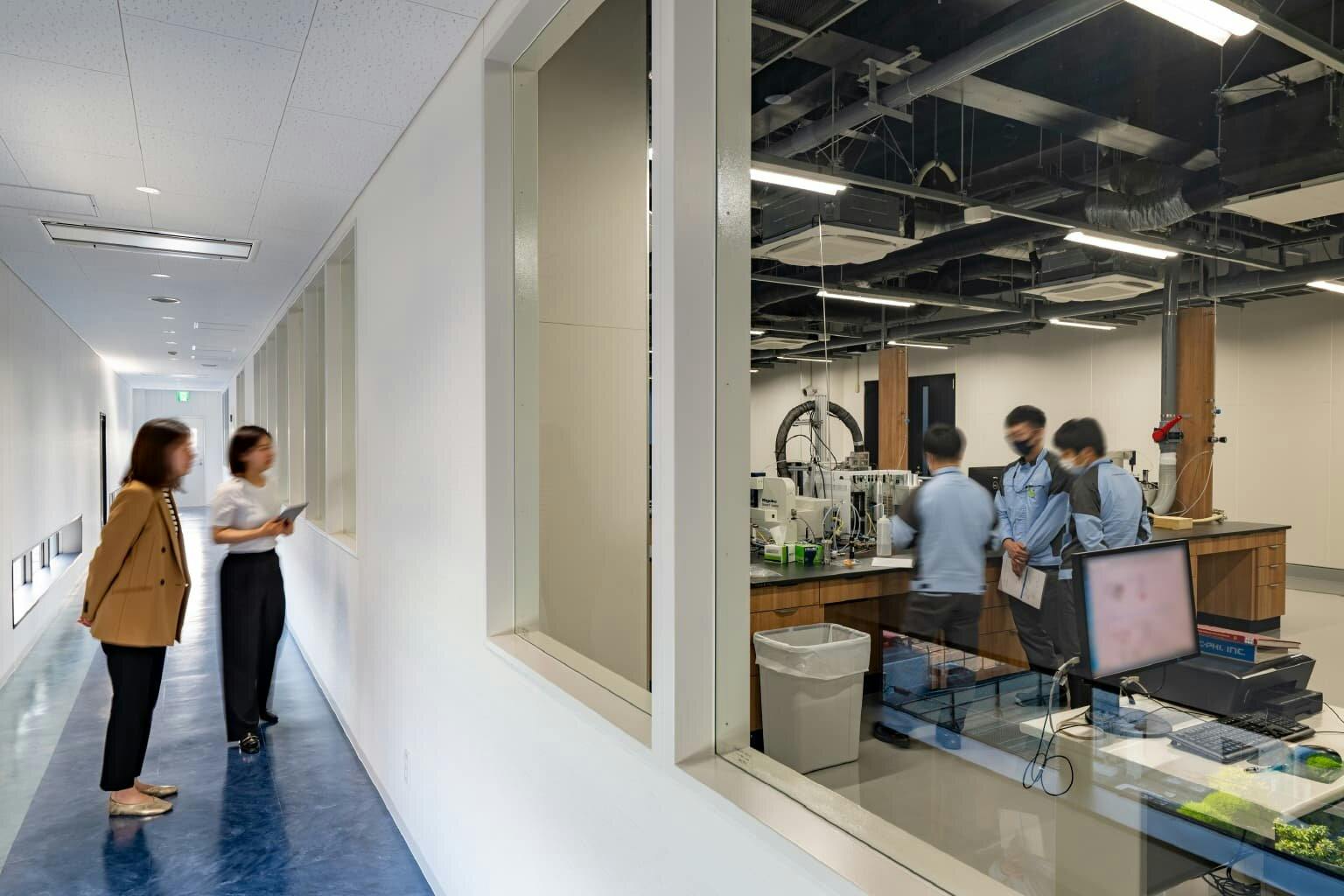 建物内には外部見学者を案内するための見学ルートが設けられています。 一般的には閉鎖的なイメージのある研究開発エリアも、廊下の窓ガラス越しに見学が可能。 この場所から今まさに「これからの100年」が生まれている――そんな期待感がクライアントとの信頼関係をさらに深めてくれるでしょう。