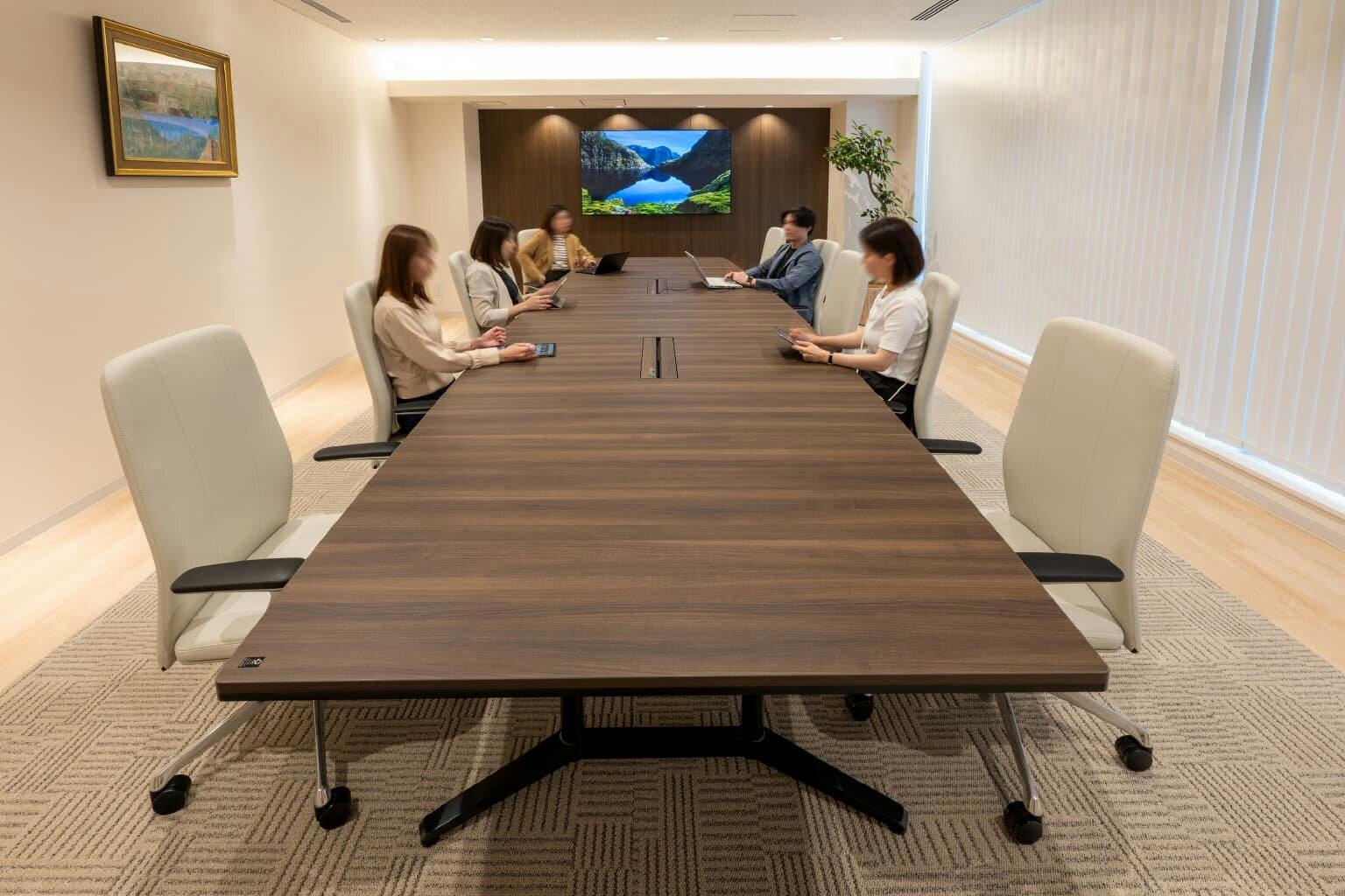 建物内には目的に応じて利用できるさまざまな会議室があります。 1階には、エントランスから訪れたお客様をスムーズに誘導できる応接会議室。 落ち着いたトーンで統一された家具や内装が来訪者の緊張をほぐし、より親密な関係に導いてくれます。