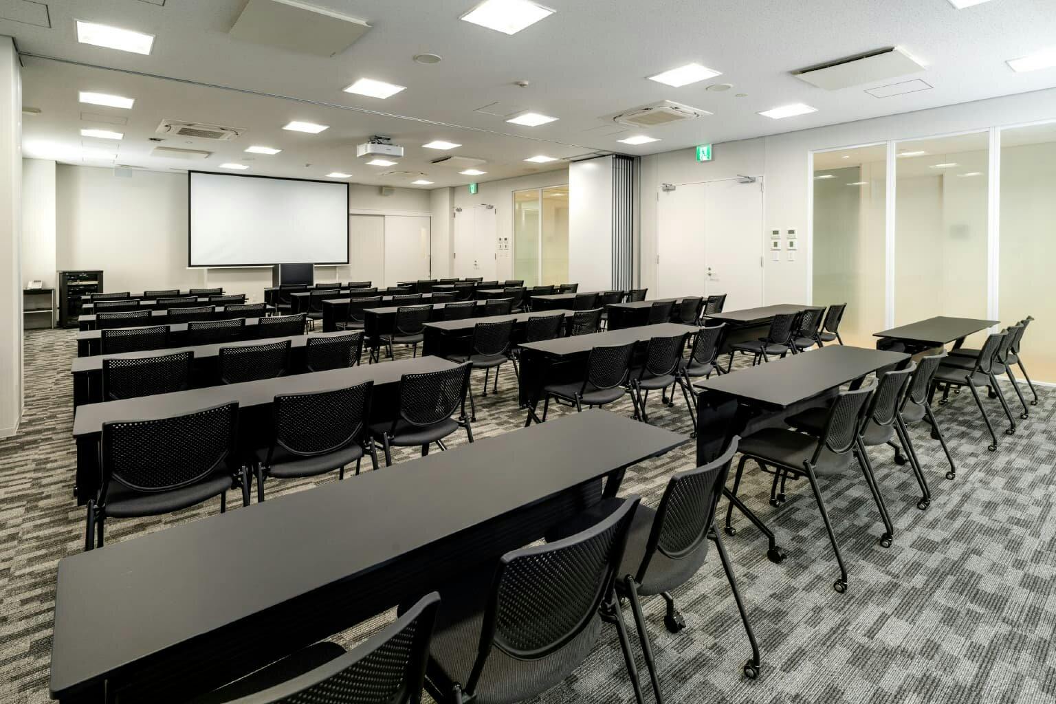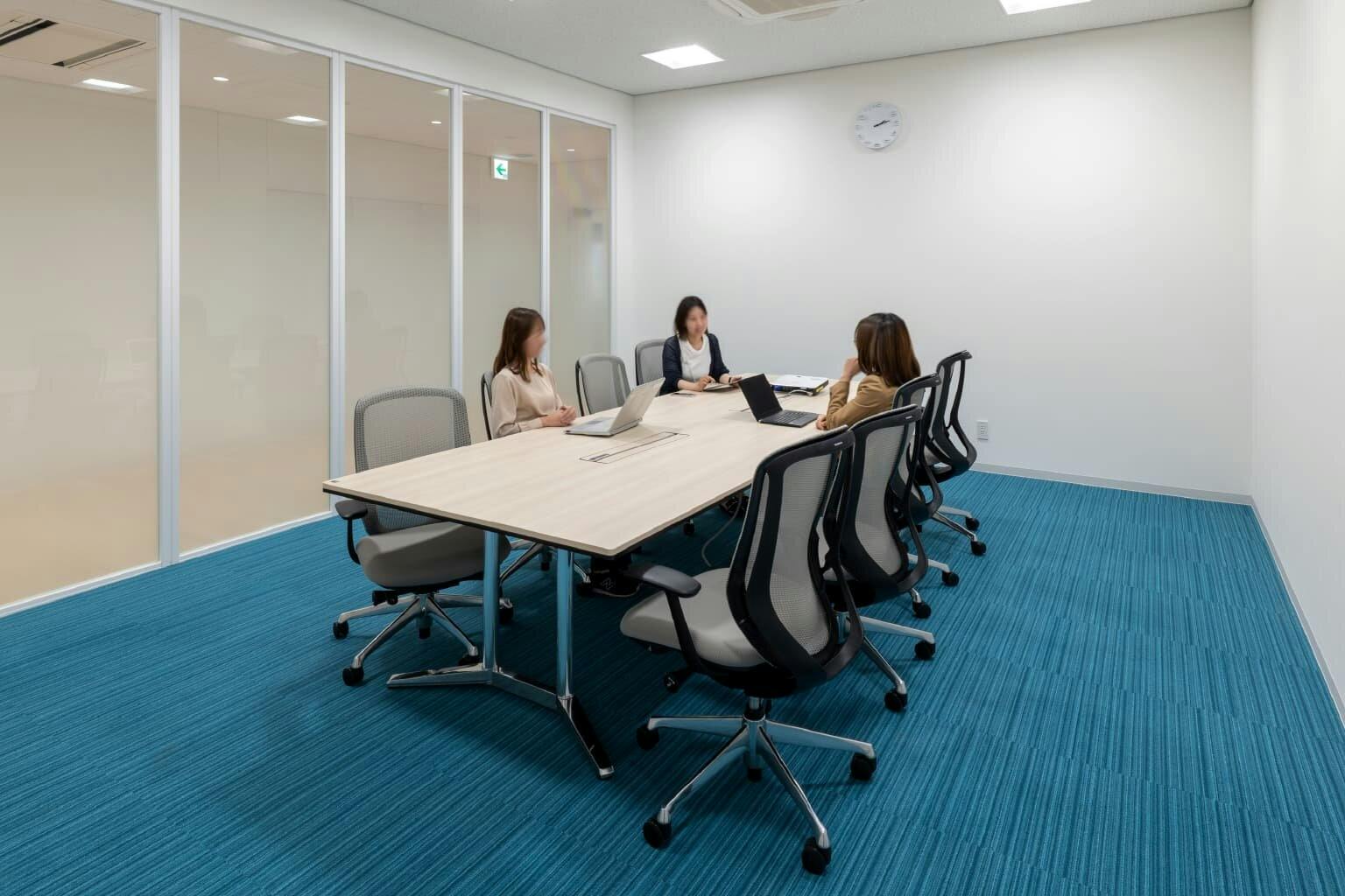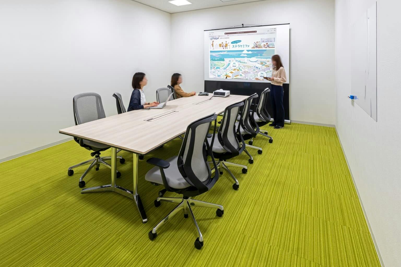 3階には8人用のミーティングルームが3部屋と、大人数で利用できる大会議室が1部屋あります。 ミーティングルームの家具はすべて同じ設えですが、部屋によって気分を変えられるように床の色がそれぞれ異なるアクセントカラーになっています。 窓のない部屋には暗闇での投影に向いているプロジェクターを設置し、光の入らない環境を有効活用しています。 大会議室は中央のスライディングウォールで仕切れば2部屋に分割可能。 研究発表や拠点会議、リクルートシーンやインターン活動などにも利用され、未来につながる情報の交差点となっています。
