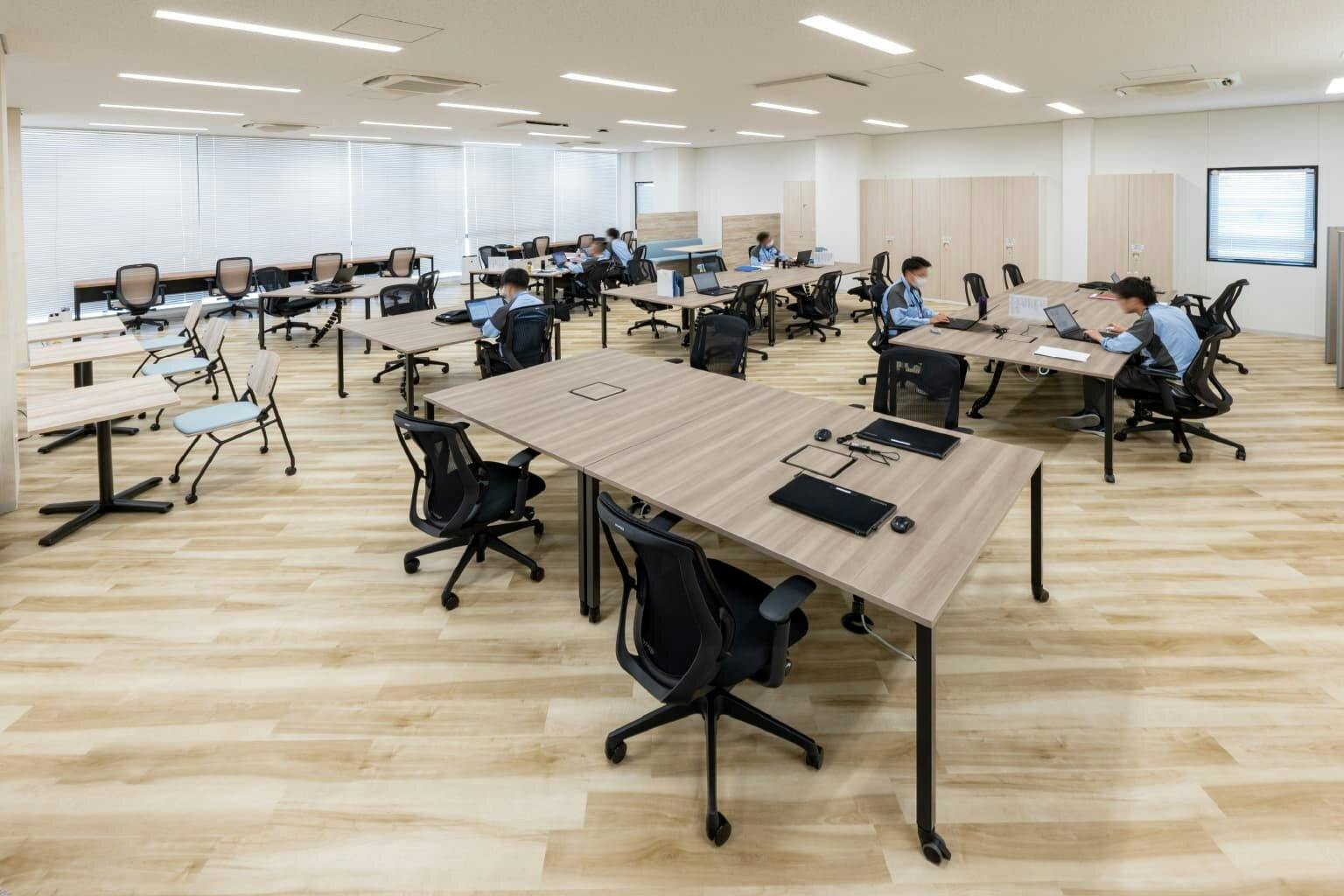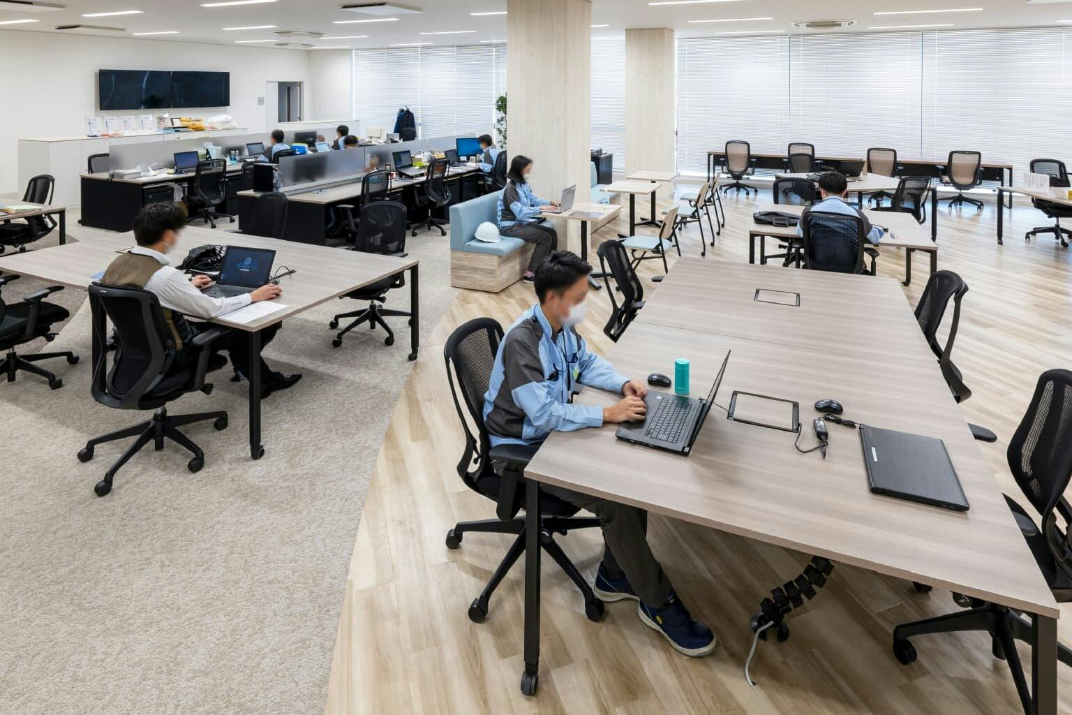 4階は壁を設けず、空間をダイナミックに使用した執務エリア。 昔からの研究スタイルにとらわれず、これからは研究者もコミュニケーションを取りながら効率的に働いてほしいとの想いから、固定席とフリーアドレス席のハイブリッド運用が採用されています。