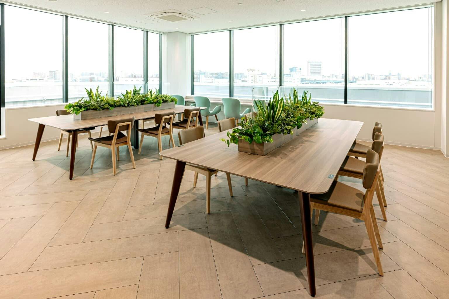 5階には、周辺の眺望を見渡しながらゆったりとくつろげるリフレッシュエリアがあります。 普段は活発にコミュニケーションを取りながら働いていても、たまには1人でちょっと一息つきたいもの。 そんな時にはこの空間を訪れて、コーヒーを片手に頭の中を整理します。 ビッグテーブルの中央に配置されたグリーンが適度に周囲の視線を遮り、自然とひとりの世界へと誘ってくれます。