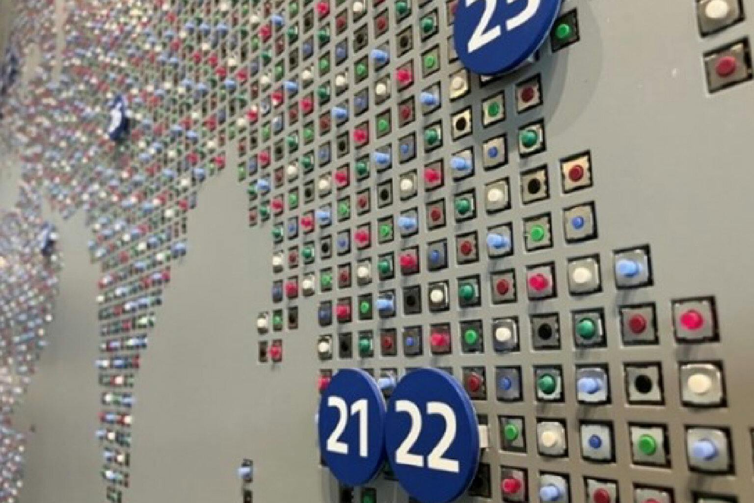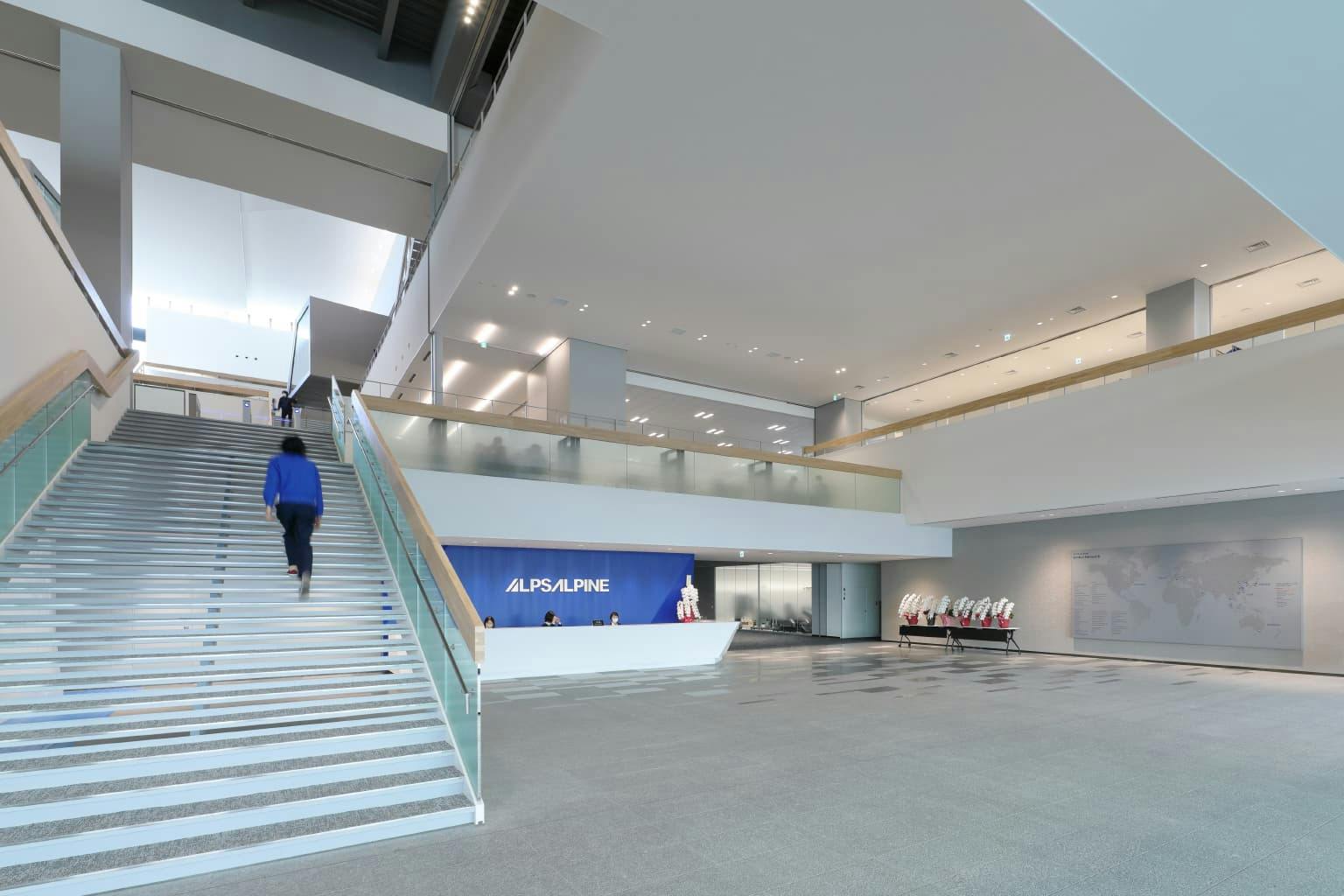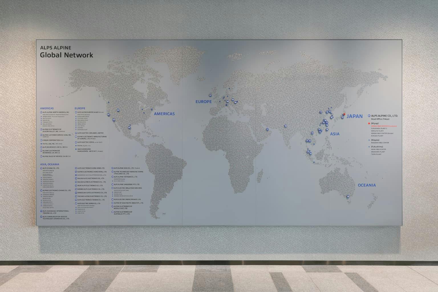 日本を中心にアメリカ、ヨーロッパ、中国、韓国、ASEANと世界のものづくりを支える事業を展開する同社には、世界各国からさまざまなお客様が訪れます。 そんなお客様をまずお迎えするのが、アルプスアルパインが製造している電子部品のスイッチで構成された世界地図。 まるで美術館に展示された壮大なアート作品のように、ゆとりあるエントランスホールを彩り、訪れたお客様の目を惹きつけます。