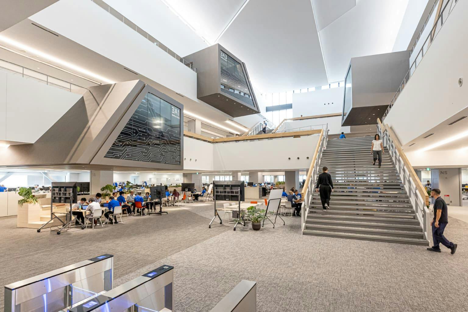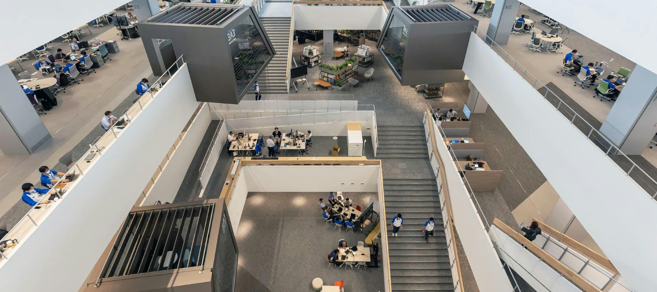 この建物は中央の吹抜けエリアを中心に、階層が幾重にも重なる複雑なフロア構造をしています。 広場のような吹抜けエリアには天窓からの光が差し込み、誰もが気軽に立ち寄れるコミュニケーションの中心地となっています。 さらに建物全体で回るようにフロアを移動する回遊動線が出会いを生み出し、社員の個性や才能を発揮させることに一役買っています。