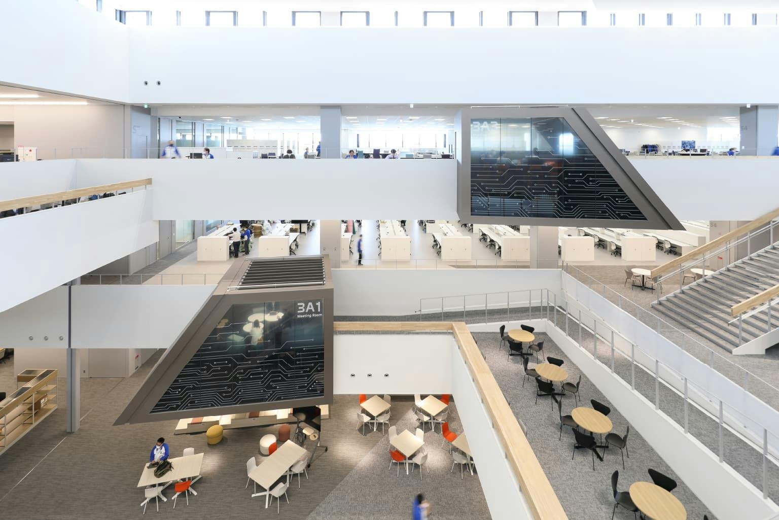 わたしたちは、オープンイノベーションを最大限に発揮することが製品の研究開発を強化する上で重要な要素だと捉えています。 そこで、宮城県大崎市にある仙台開発センター(古川)内の既存棟3棟を取り壊し、「緑豊かな古川の地で、世界中の知と技術を融合し触発するイノベーションコア」をコンセプトとするR&D棟を新設します。 新たな働き方を実現する最先端オフィスには、これまで各地に分散していたIC設計、車載センサー並びにコンポーネントなどの開発機能を集約します。