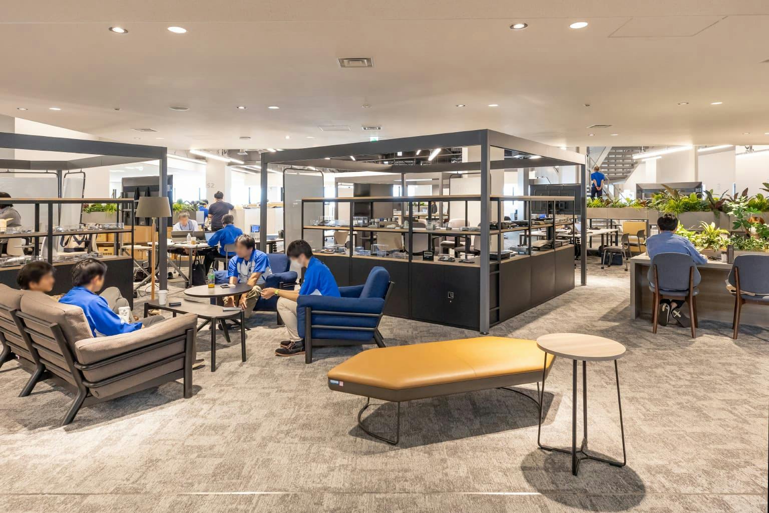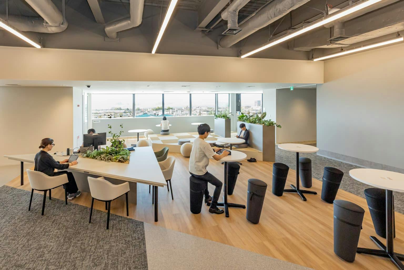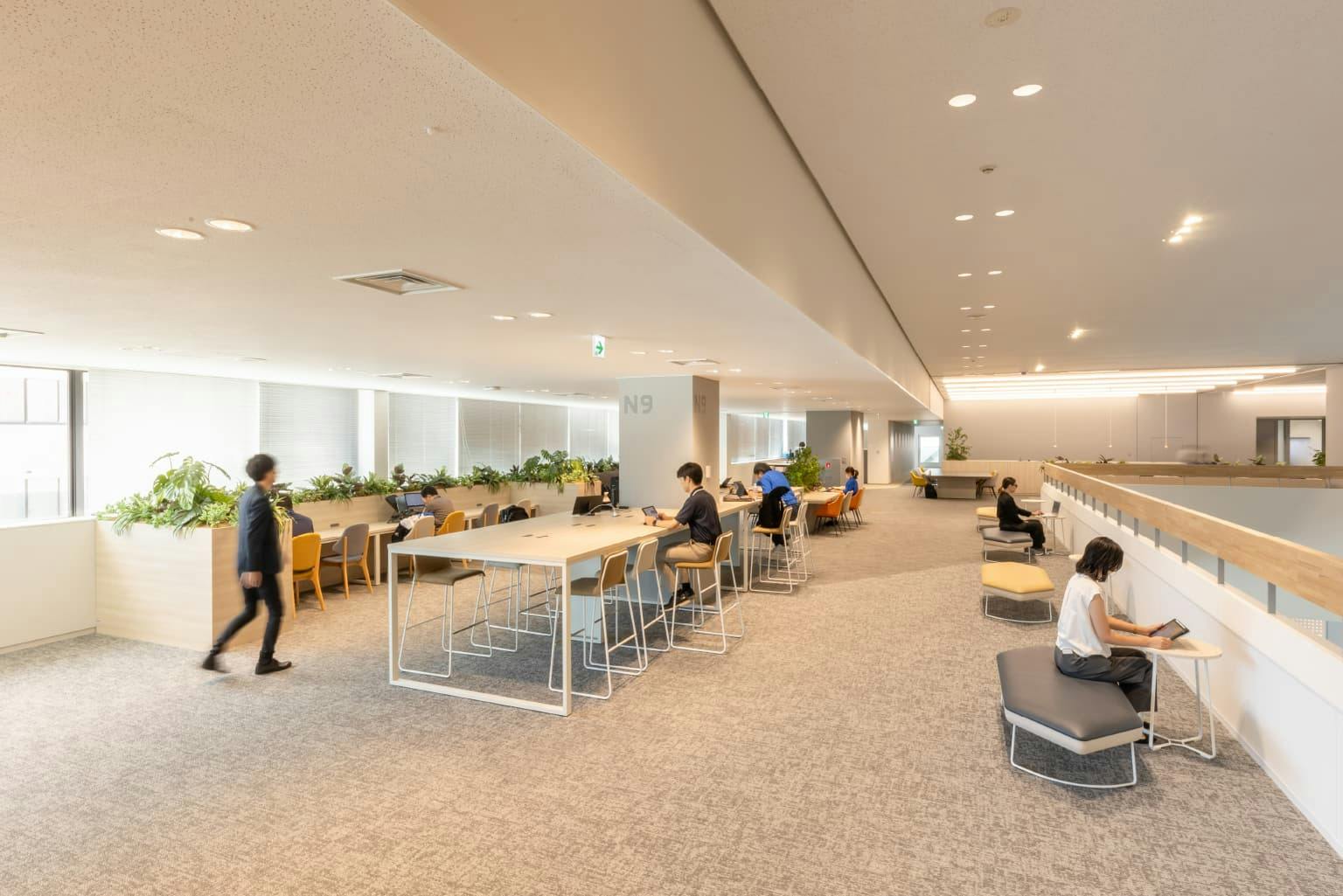 中央階段まわりには、「ワイガヤ」と称されたコミュニケーションエリアがあります。 各階ごとに異なるテーマが設定されており、2階は「出会う・つながる」がテーマ。 カジュアルで落ち着いた雰囲気で、さまざまなコミュニケーションができる空間となっています。 さらに2階は他拠点から来た人がクイックに利用できるタッチダウンエリアとしての機能も。 外部からの刺激を受けることで更なるイノベーションが起こりそうです。
