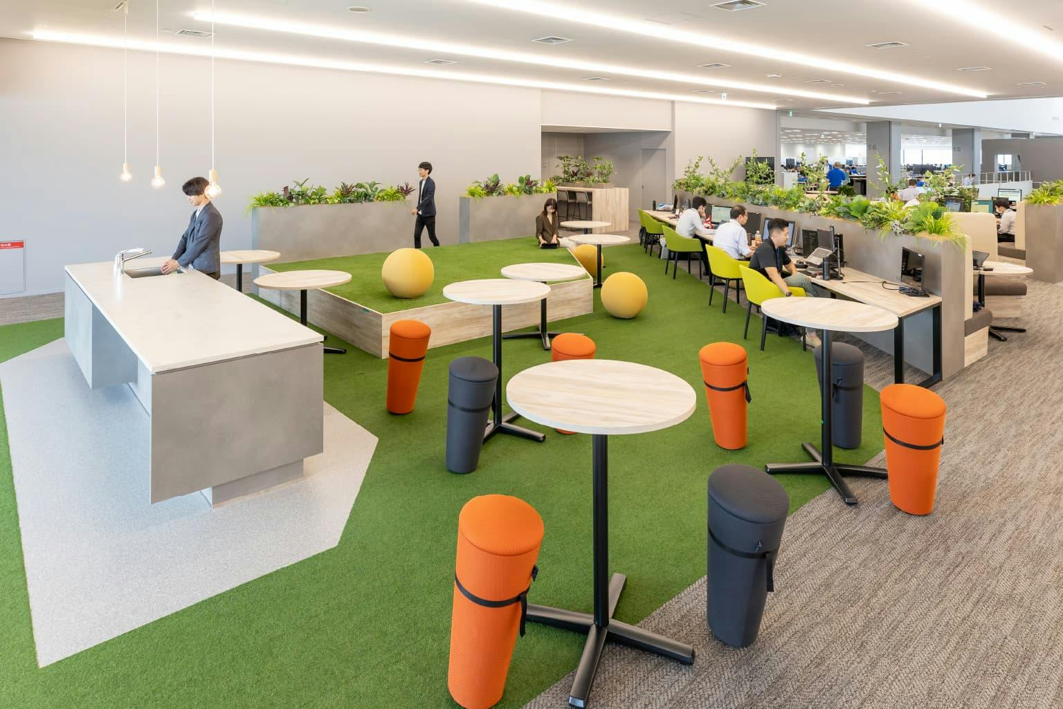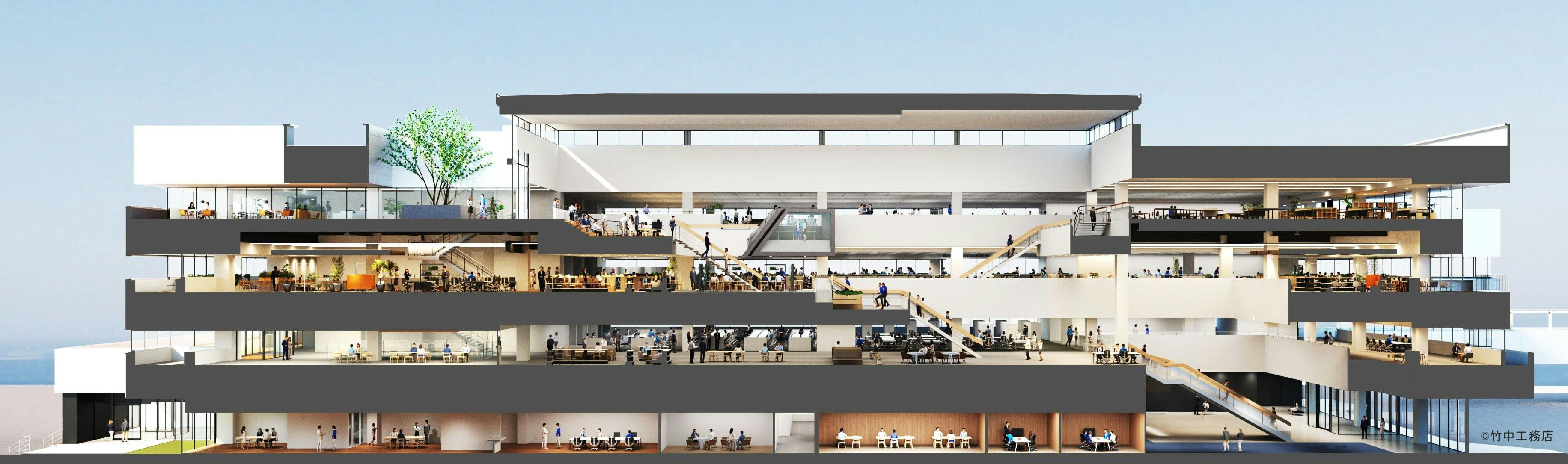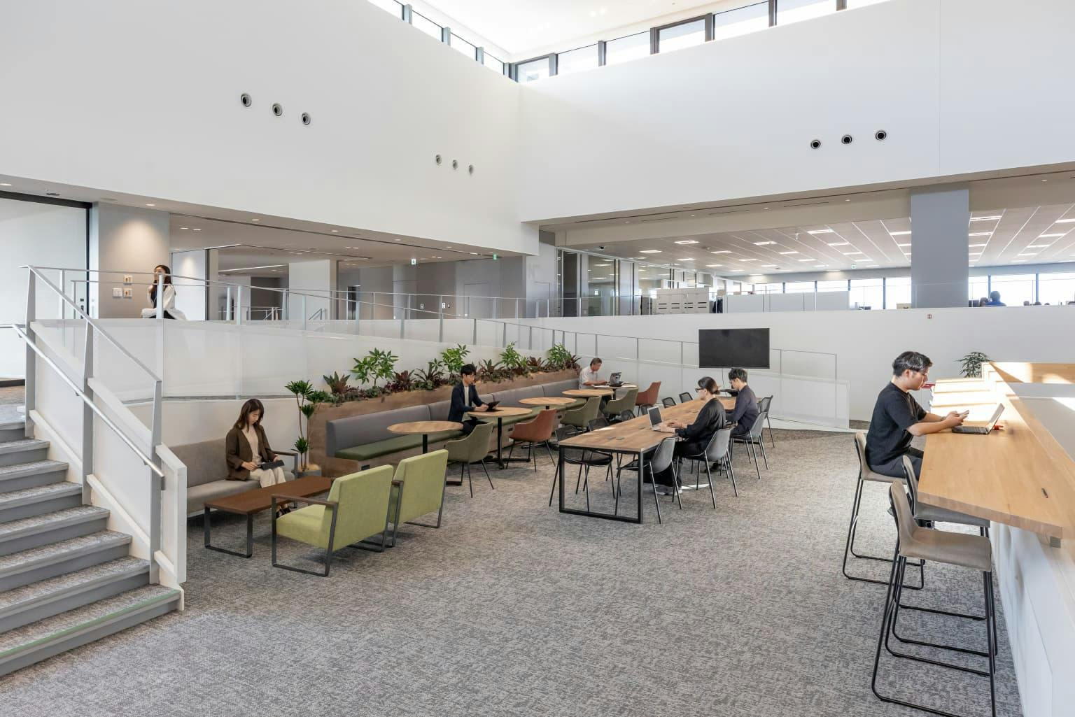 建物のあらゆる空間が回遊動線でつながり、人と人との「KYO-SO(共想・共奏・共創)」が生まれるスポットがそこかしこに点在しています。 社員が多様な空間の中から自分が心地よく働ける場所をみつけ、社内外を問わずアイデアを組み合わせることで、新たな社会的価値を創造していくことでしょう。