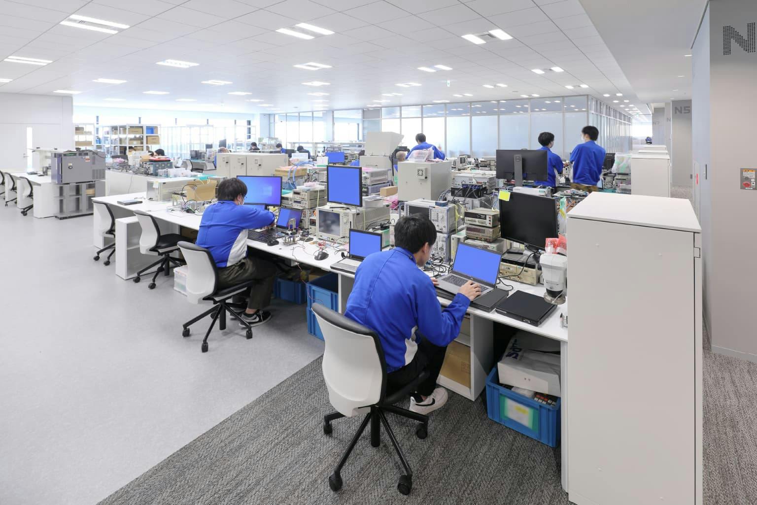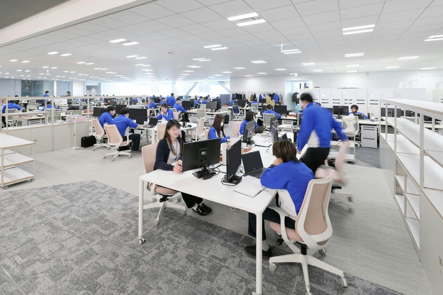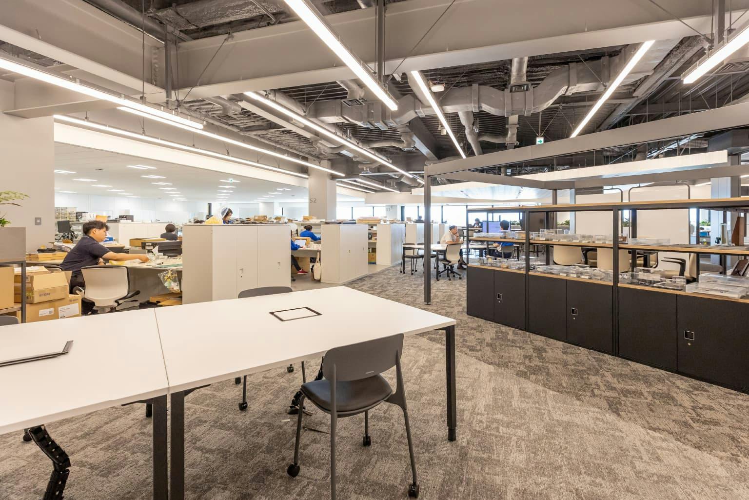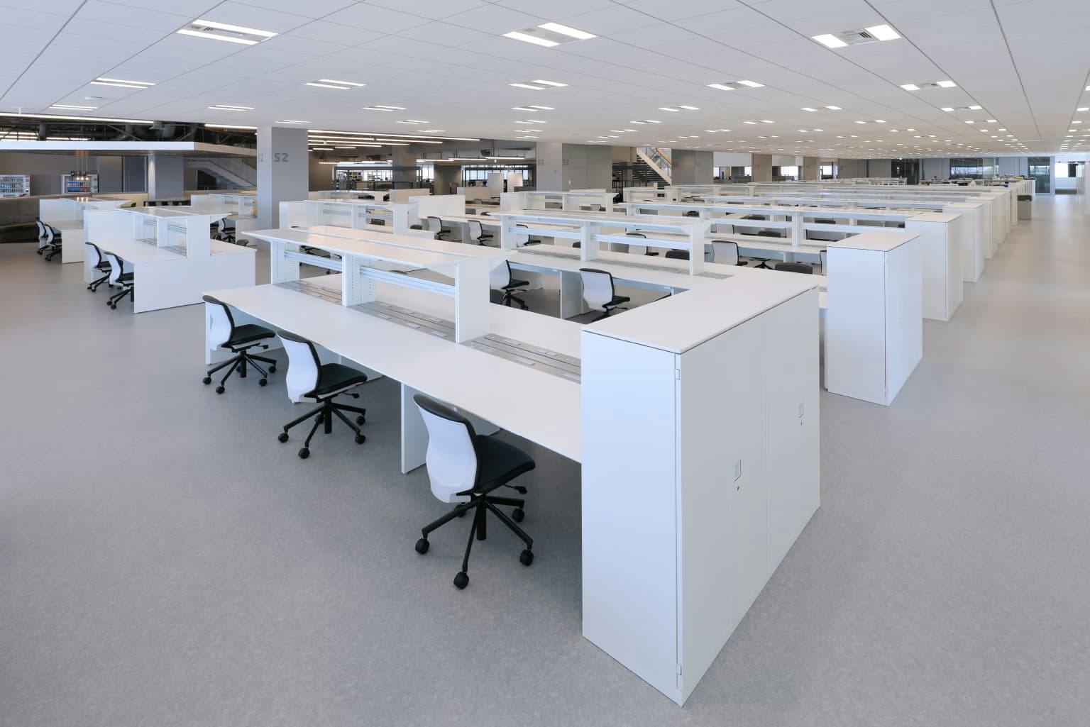 3階は、主に実験や試作評価を行うエンジニアが働きやすいフロア。 窓側に専門的な作業を行う個室を多く設けていますが、フロアの大部分は壁のないオープンな空間で、エンジニアもチームや関連部署と連携しながら研究開発を行います。 デスクを規則的に配置することで、部署や個人を限定することなく自由に空間を活用できます。 実験台は特注対応で上棚を取り外せるようになっていますが、これは同じ実験台を別の部署が異なる目的で使うシーンを考慮してのこと。 可変性に富んだ実験空間は、エンジニアにいつも最適な環境を提供し作業効率を高めてくれます。