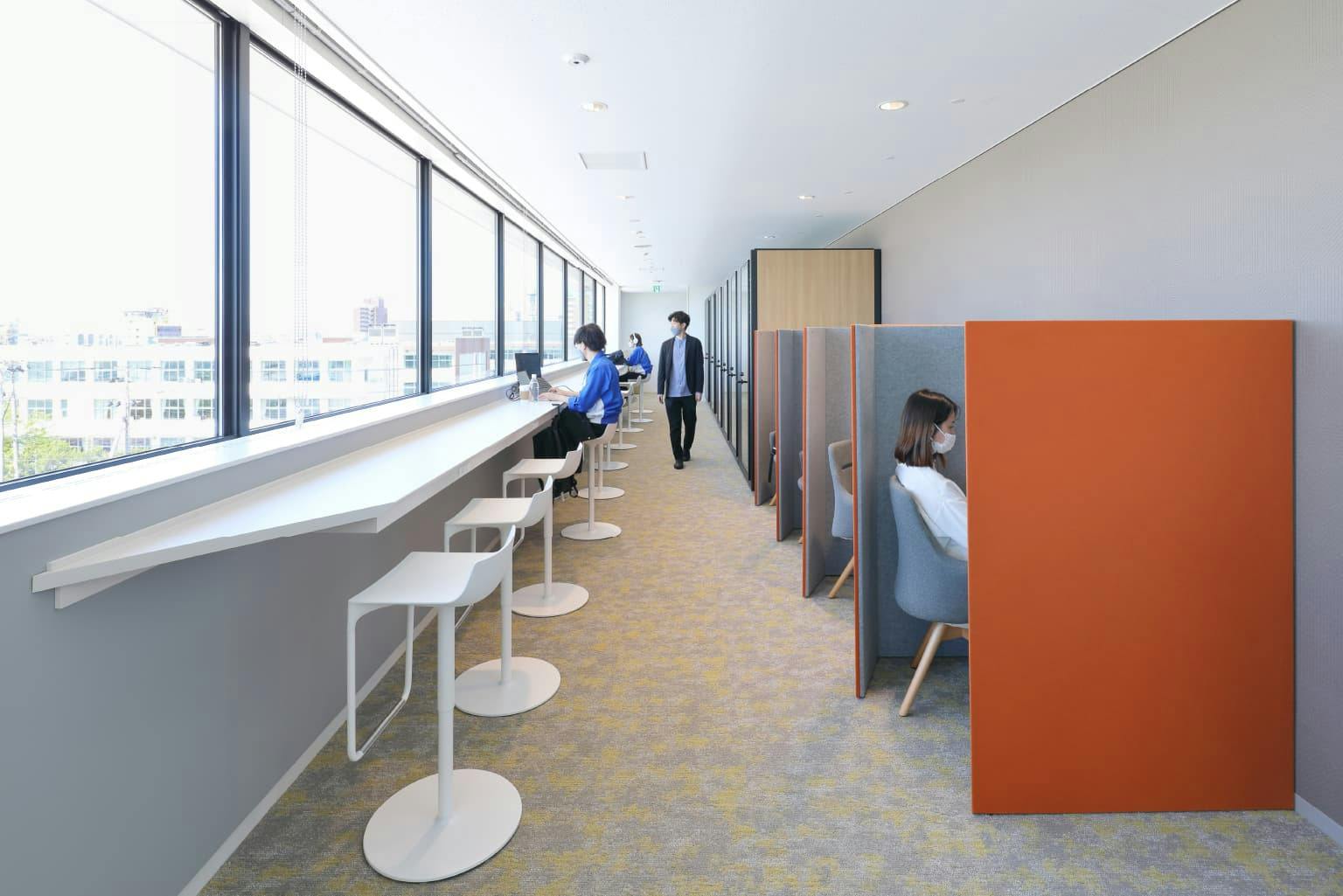 2階と4階の大部分を占める執務エリアは、中央吹き抜けから窓側に向かって層のように機能が変化するレイアウト。 吹抜けに近いエリアはクイックに働ける席、窓側に近づいていくとチームで働くための席と、多様な環境の中から直感的に最適な場が選べます。 執務エリア内の固定席や、ABWを活用したフリーアドレス席、ワイガヤエリア等もあわせると社員全員が出社しても座れるように席が配置されています。