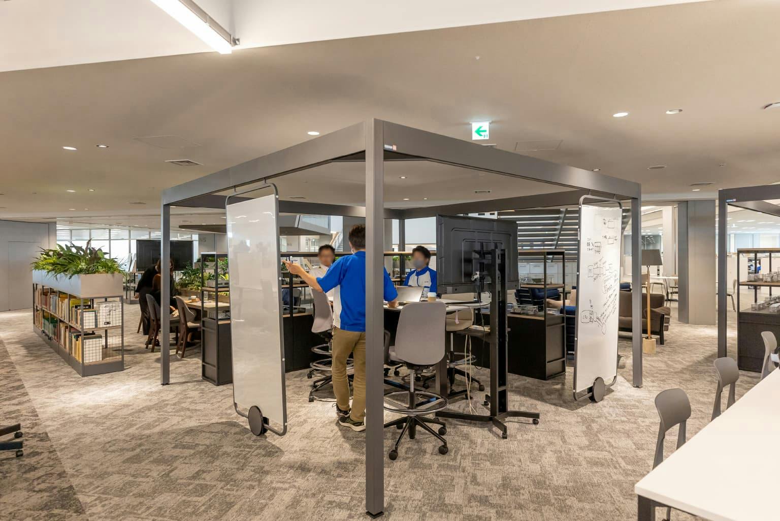 また、拠点集約前は部署ごとに部屋が分かれ閉鎖的でしたが、集約後はワイガヤエリアで積極的に他部署とのコミュニケーションをとることもできるように。 やぐらを使った空間では、試作品や製品を持ち寄りチームメンバーとスピーディーな検討会も行われています。