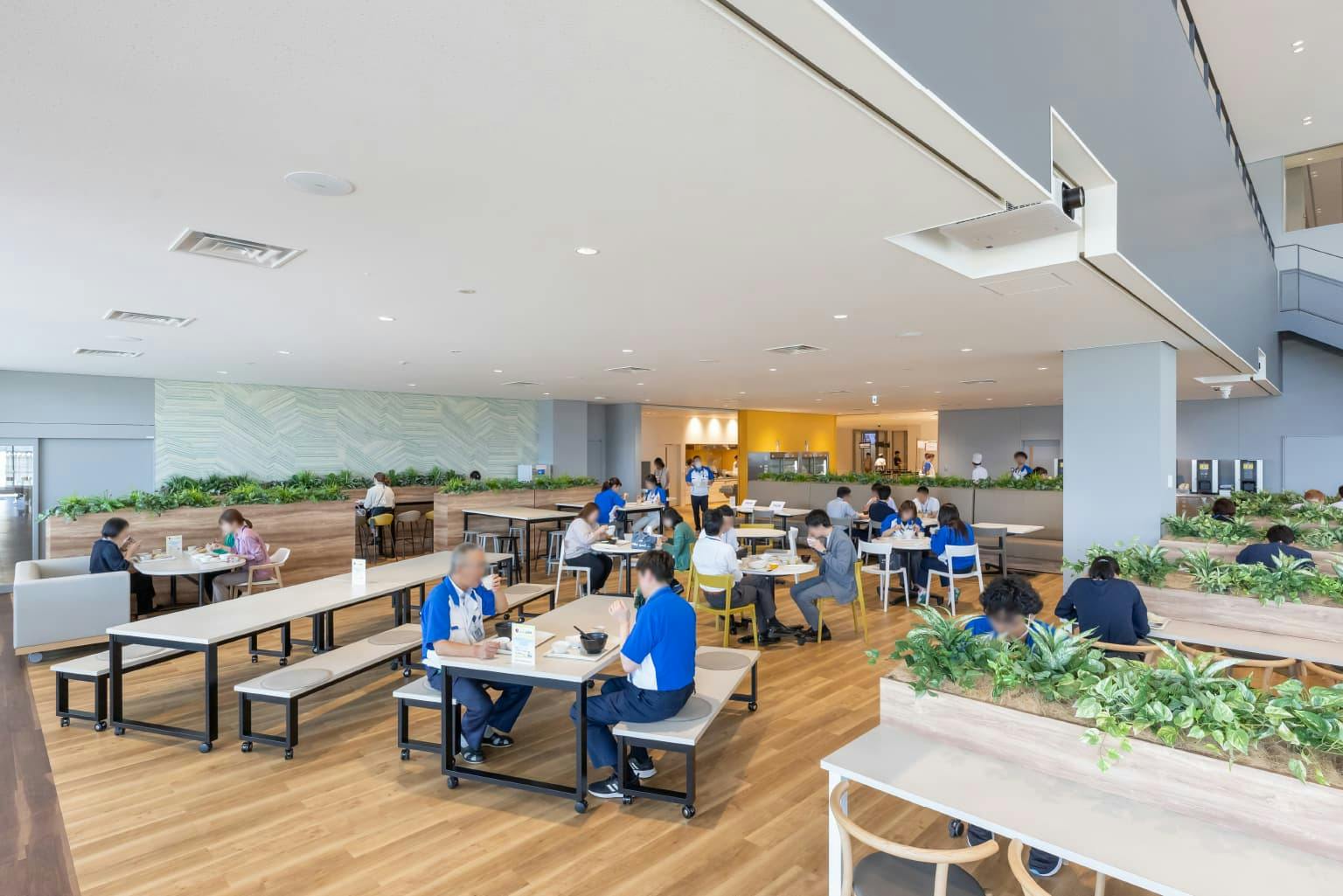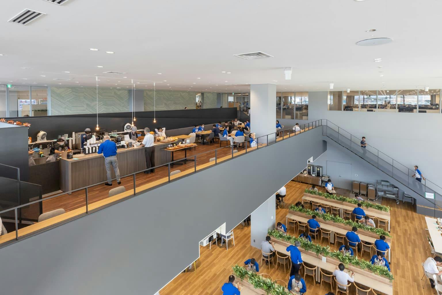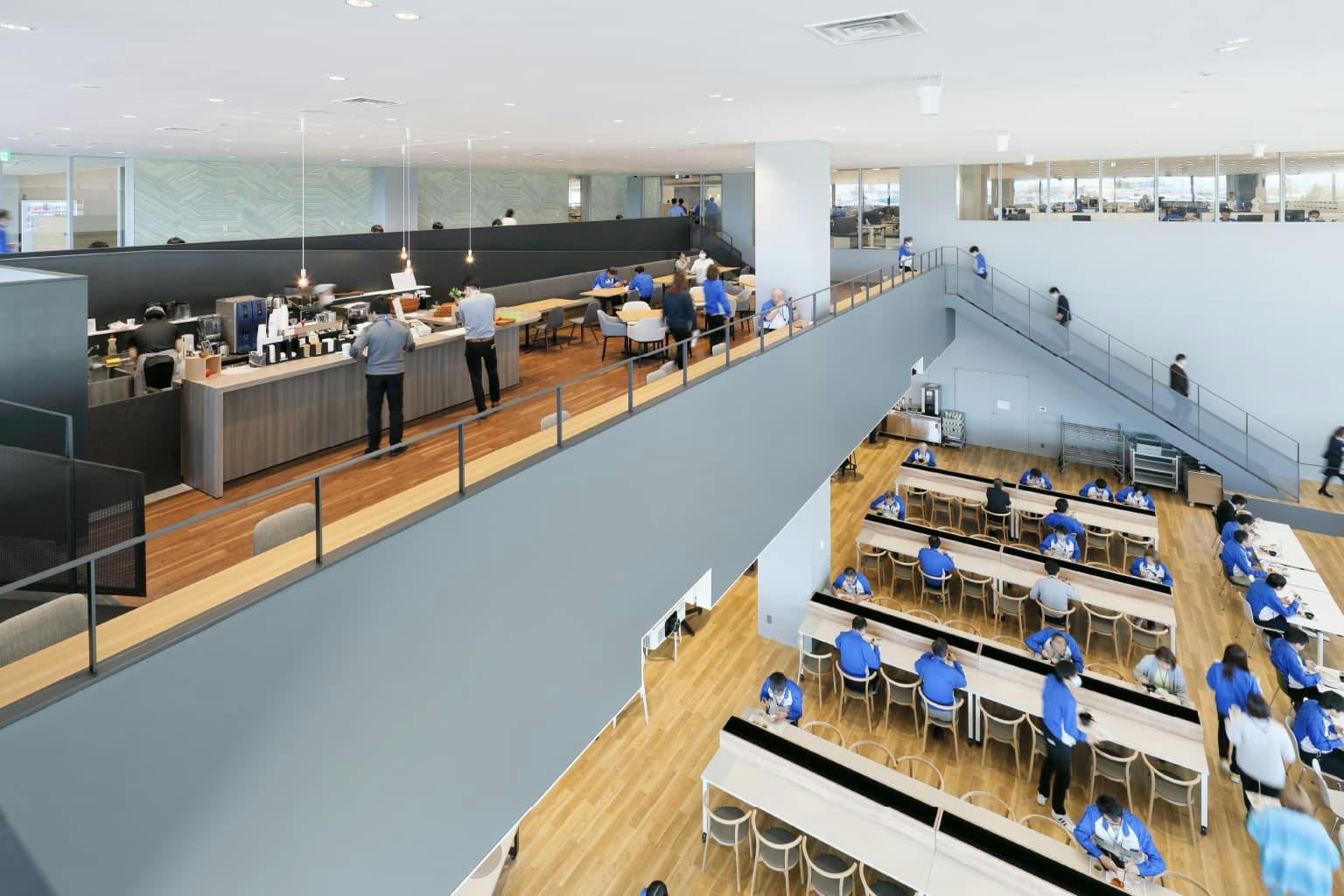 1階には500名以上が同時に利用できる豊富なメニューが自慢の社員食堂があります。 ここは仲間と食事をとりながらお喋りするシーンがとてもよく似合う、カジュアルで賑やかな空間。 食堂から中階段を上って2階のカフェに訪れると、淹れたてのコーヒーを楽しむこともできます。 食堂全体を上階の執務フロアからも眺められるので、混雑状況がすぐに把握できます。