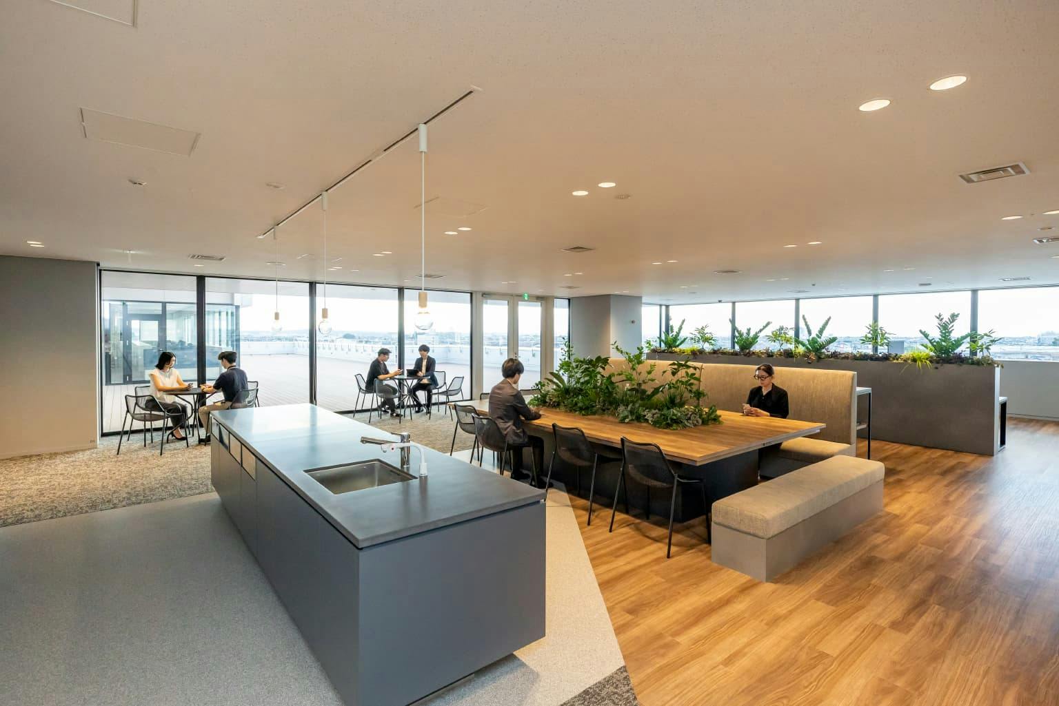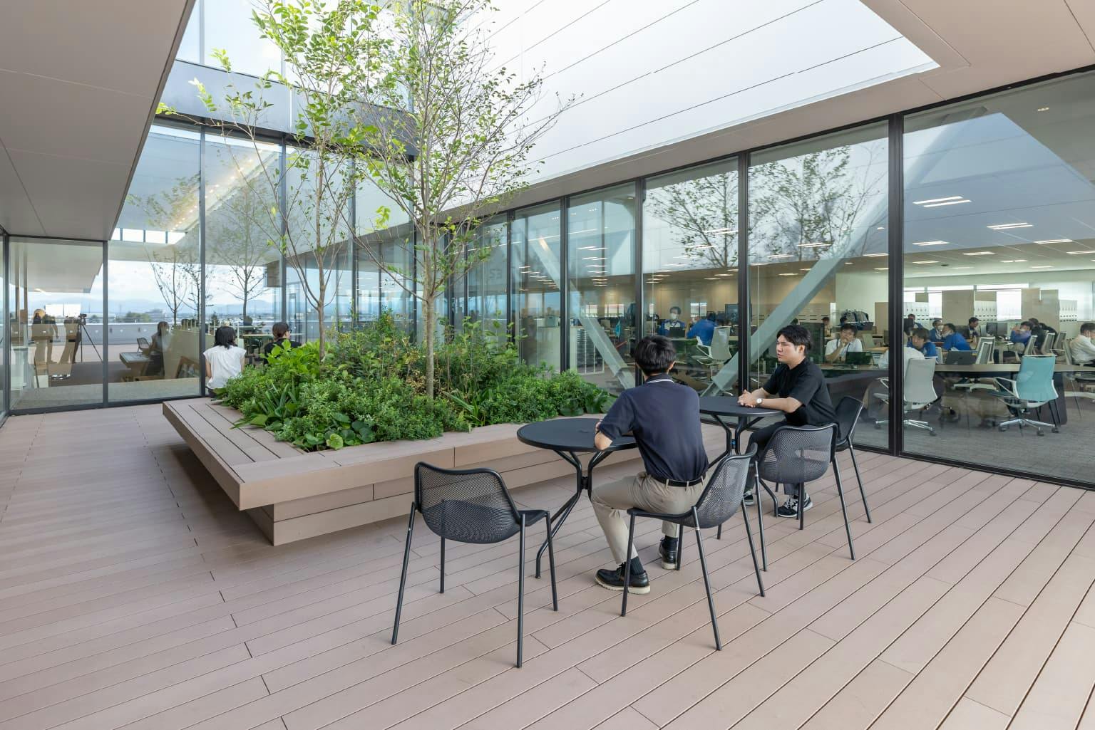 4階のテラスでは、自然の風を感じながらほっと一息。 業務で疲れた頭を休めてリフレッシュできます。 北西側リフレッシュエリアもテラスに面しており、大自然を見ながらチームで会議するなど、普段とは異なる刺激に脳内も活性化されそうです。
