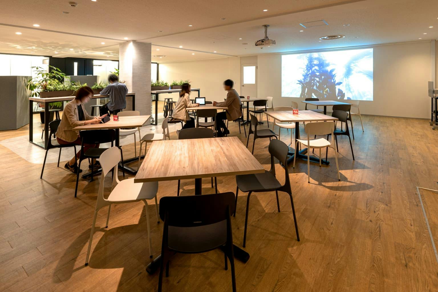 4階は「紡ぎ」がキーワード。 中央のカフェが各所を紡ぐ結び目となり、リラックスやフレキシブルなど異なる機能を持つ複数のエリアで構成されています。 テーブルを並べ替えて大人数での打合せ、ソファ席で同僚とランチ、カフェでのコーヒーブレイク。 ここは、ひとりでも、仲間とでも、そのときどきに合わせていつも寄り添ってくれる場所です。 さまざまなシーンが絶妙なハーモニーを奏で、この場で過ごす人々に熱気と癒しを与えてくれるでしょう。