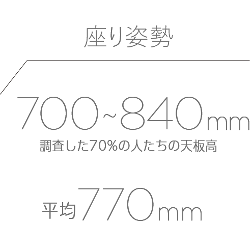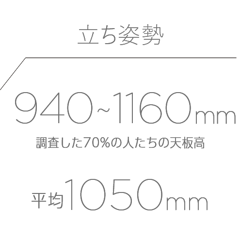 一般的に事務用デスクはH720mm、ハイテーブルはH1000mmですが、利用者の体格によって丁度いい天板の高さは異なります。高さが合わないデスクやテーブルを長時間使用し続けると、肩や首回りなどに疲労がたまりやすく、体の不調や効率の低下につながります。健康的に働く為には、ひとり一人の体格に合わせて天板の高さを調整し、体と家具のギャップを少なくすることが大切です。
