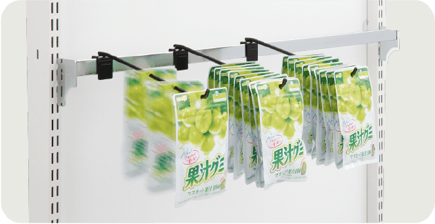フックに角度が付いており、手前の商品を取ると奥の商品が自然に前へ滑り、前出し作業の負担軽減になります。