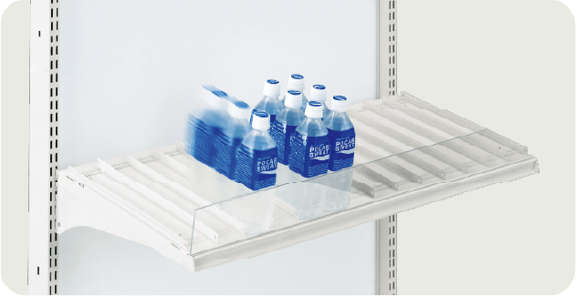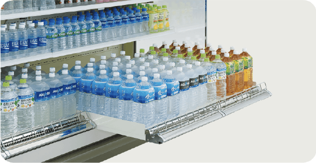 角度のついた棚の表面に特殊塗装を施しており、商品を自動で前出しします。商品のフェイシング作業を省人・省力化します。