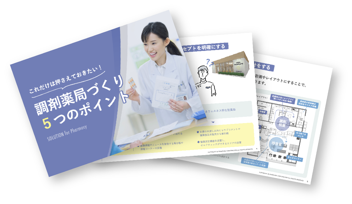 レイアウト、什器、内装デザインなどを含め、お客様のご希望を丁寧にうかがい、「選ばれる」調剤薬局づくりをトータルでご提案いたします。