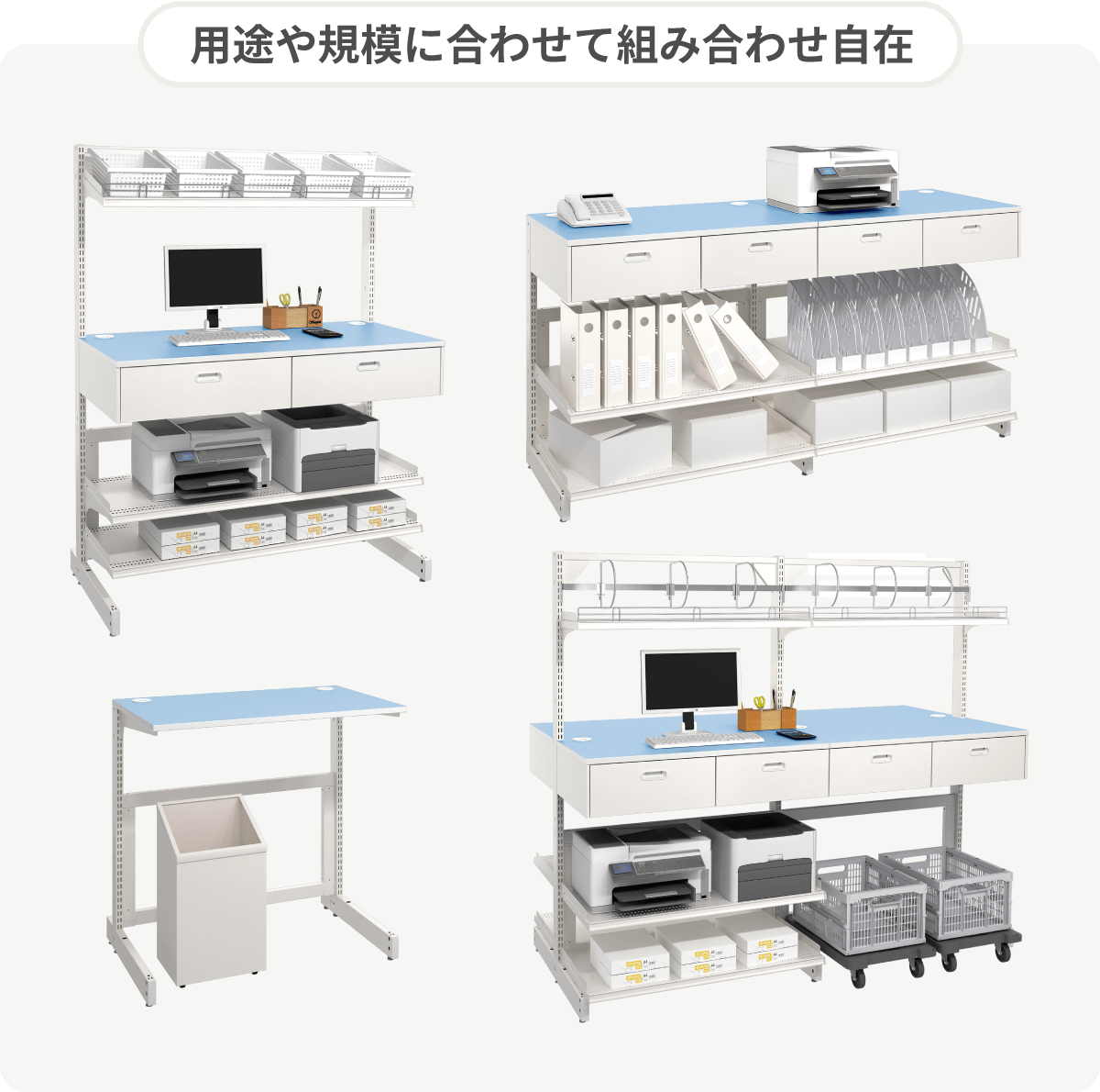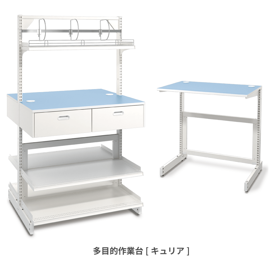 スリット式で棚位置も自由に設定でき、オペレーションにあわせた豊富なアタッチメントも選択可能な、調剤室の監査作業や各種事務作業の使い勝手を徹底的に考えた作業台です。