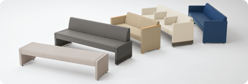 - バリエーション豊富なロビーチェア。ベーシックなタイプから肘・脚が木仕様になったラグジュアリーなタイプまで、休憩室のイメージに合わせて選べます。