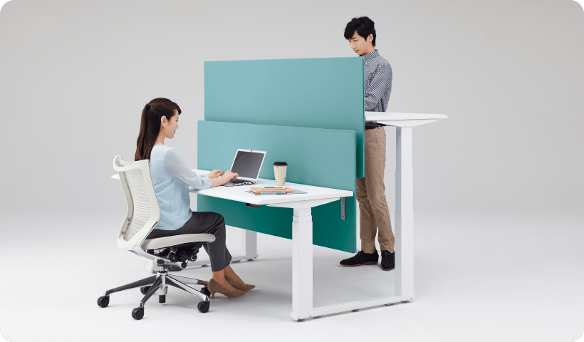 [スイフト]- じっくり作業は机を低く、机を高くしてちょっとした作業を。電動の昇降式デスクで作業の効率化に繋がります。