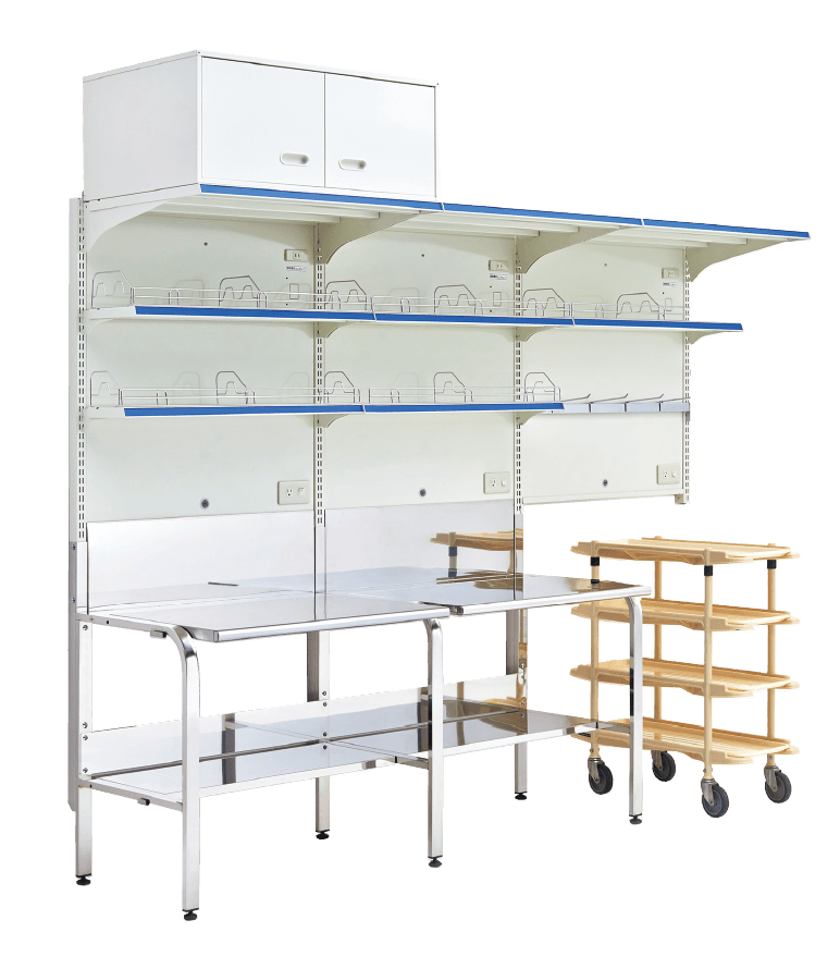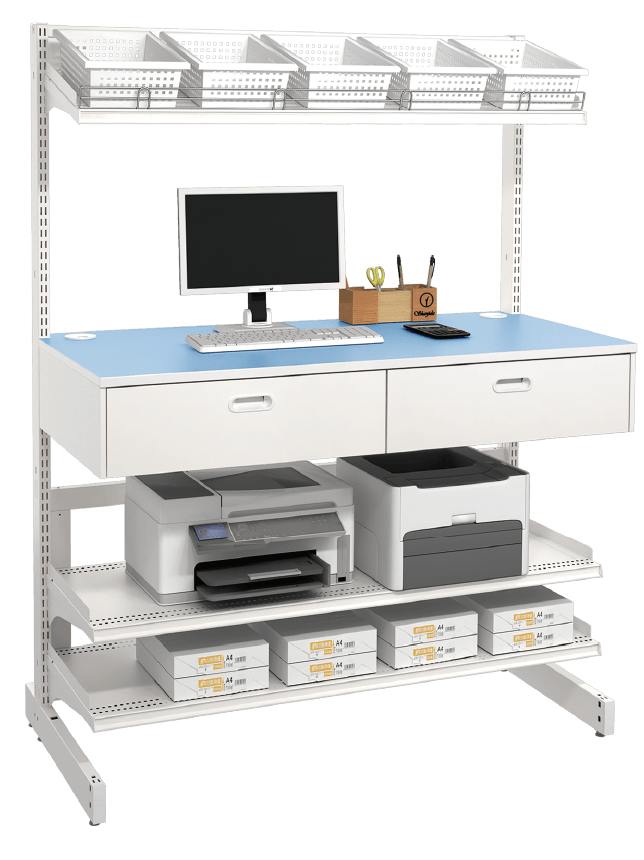 多目的作業台[キュリア]- 連絡事項書類やパソコン、備品など、煩雑になりがちな物を整理し、使いやすいバックヤードを実現できる作業ステーション。使い勝手にあわせて組合せ可能、豊富なゴンドラアタッチメントを使用できます。