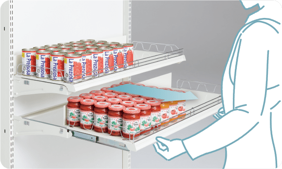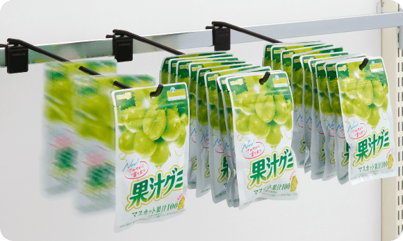 - スライド棚やスライドトレイなら、楽な姿勢で先入先出し・前出し作業が可能。棚の奥まで見えるので棚卸作業の時間短縮にもつながります。フックに角度が付いたフェイスアップフックは手前の商品を取ると奥の商品が自然に前へ滑り、前出し作業の負担軽減になります。