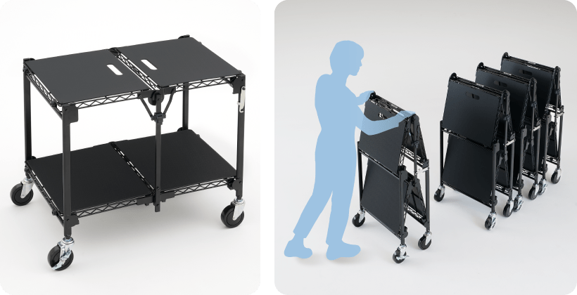 折りたたみ2段台車[オリコロ]- 天板面でのちょっとした作業や品出しに活用できる、折りたたみ式2段台車。使用しないときは折りたたんでバックヤードのスペース確保、展開もスムーズ操作で負担になりません。