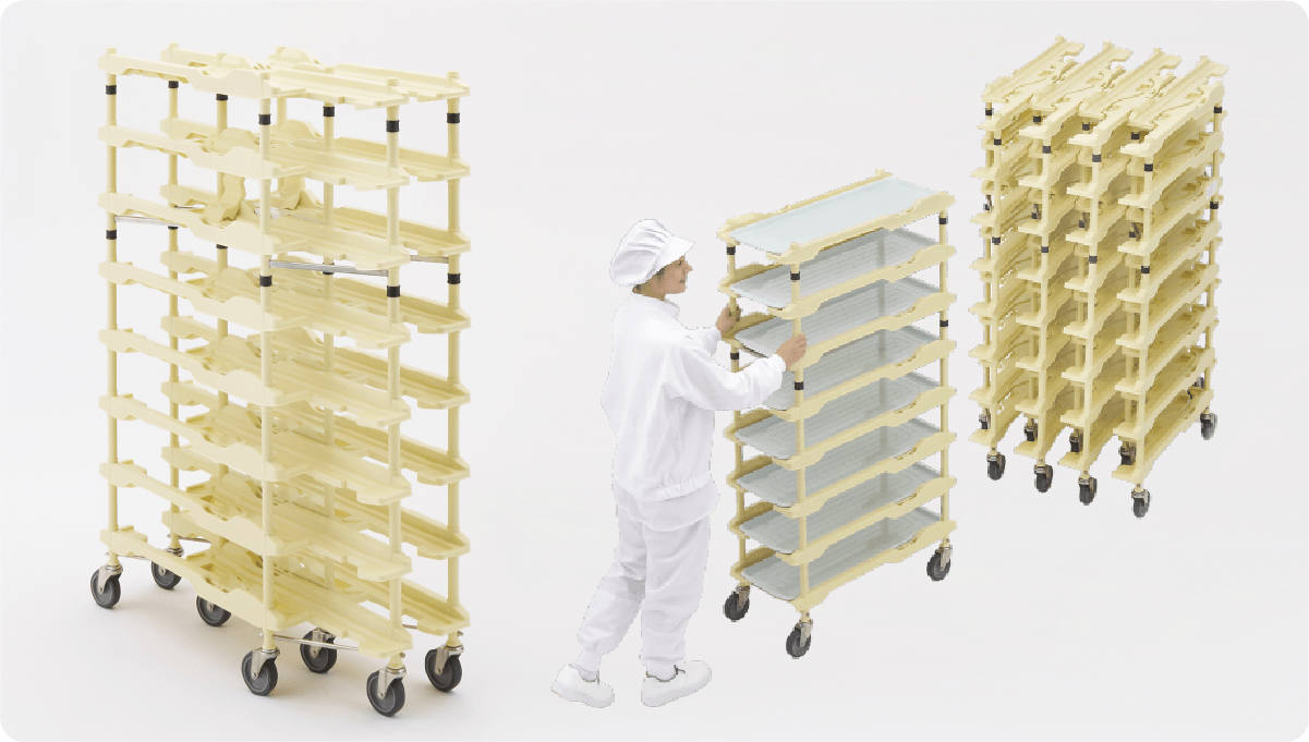 - 折りたたんで作業スペースを確保できるトレイカートFをはじめ、効率的な作業を支援するさまざまなカートをご用意しています。
