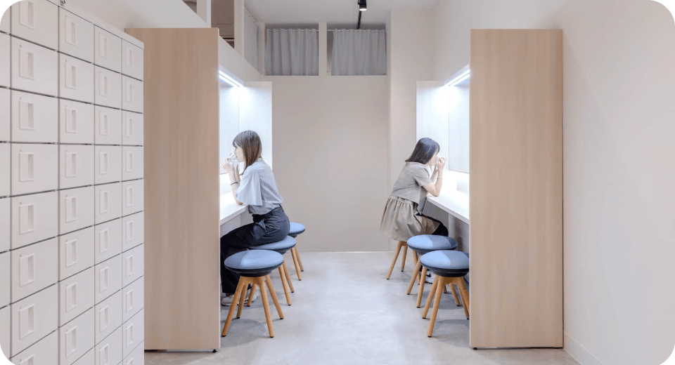 [レスピア]- 温かみと清潔感のあるデザインのパウダールームとロッカールーム。業務時間外に過ごす場所の快適性の向上が、スタッフのモチベーションアップにも繋がります。