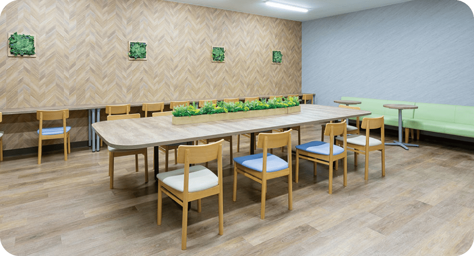 休憩室は気分をリフレッシュしたり、仲間と談笑したりすることで、スタッフが働く活力を得る大切な場所です。
